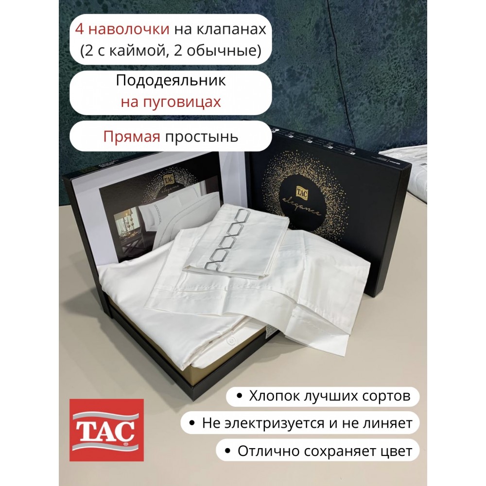 Турецкое постельное белье из коллекции TAC SATIN DE LUXE – это белье класса люкс, которое изготавливается из премиум-сатина. При производстве сатина DE LUXE используются технологии реактивной печати и мерсеризации, что обеспечивает ему яркие и стойкие краски, мягкость, изысканный естественный блеск и другие прекрасные качества. Сатин ДЕ ЛЮКС невероятно гладкий и приятный на ощупь, он прекрасно пропускает воздух, впитывает влагу и испаряет ее, что позволяет телу человека дышать во время сна, не электризуется, не скользит по кровати, сохраняет цвет и форму и практически не мнется. Состав: 100% хлопок. Комплектация изделия: пододеяльник 200х220 (на пуговицах) – 1шт., простыня (обычная) 240х260, наволочки на широком запахе: 50х70 - 4 шт (2 с кантом), плотность ткани 220тс. Упаковка: подарочная коробка. Производство - Турция.
